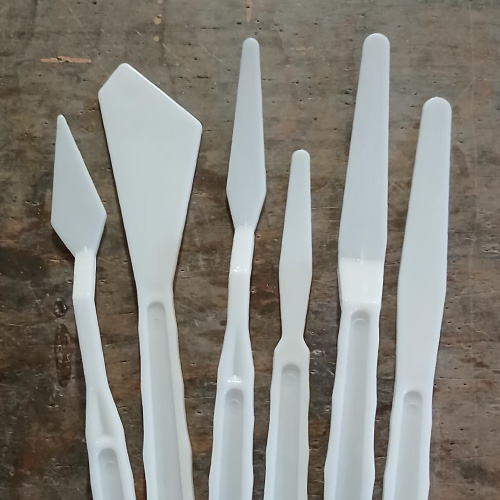 A set of five plastic palette knives, different shapes, ranging from 16-19 cm long.